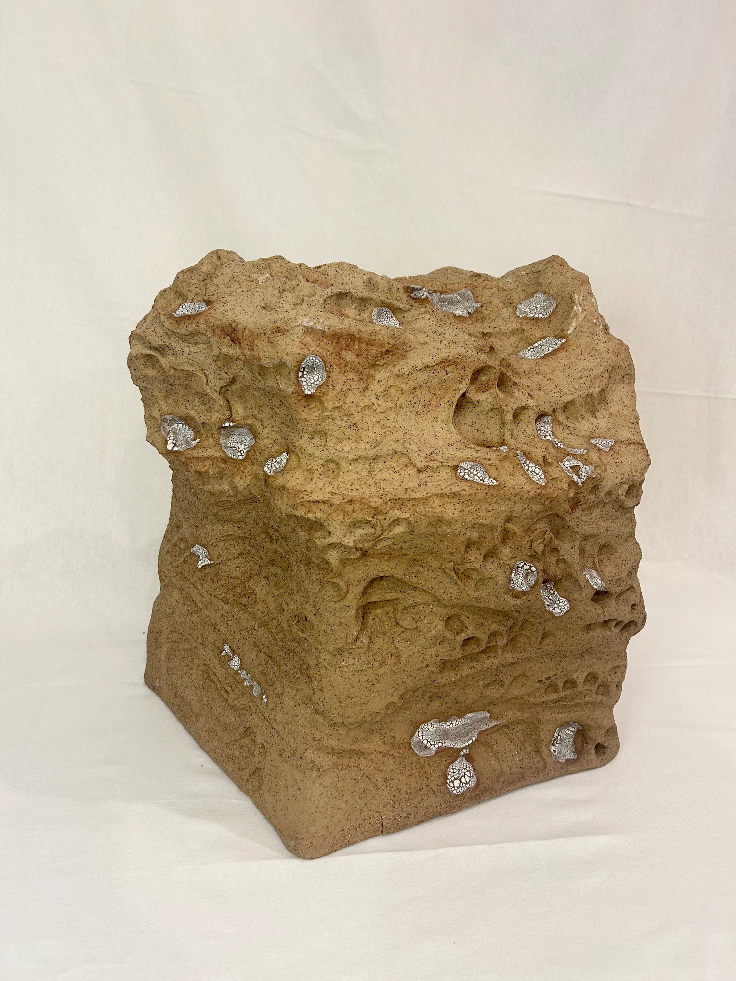 This ceramic totem explores the relationship between nature and human-made structures along the shoreline. The erosion caused by the tides shapes intricate patterns in rock and cement breakwalls, symbolizing nature's power and persistence. Life emerges in these eroded forms, showing nature’s resilience. The work reflects on the impact of environmental changes, highlighting the overtaking of man-made creations by natural forces and urging a deeper appreciation for the fragile coastal ecosystems.