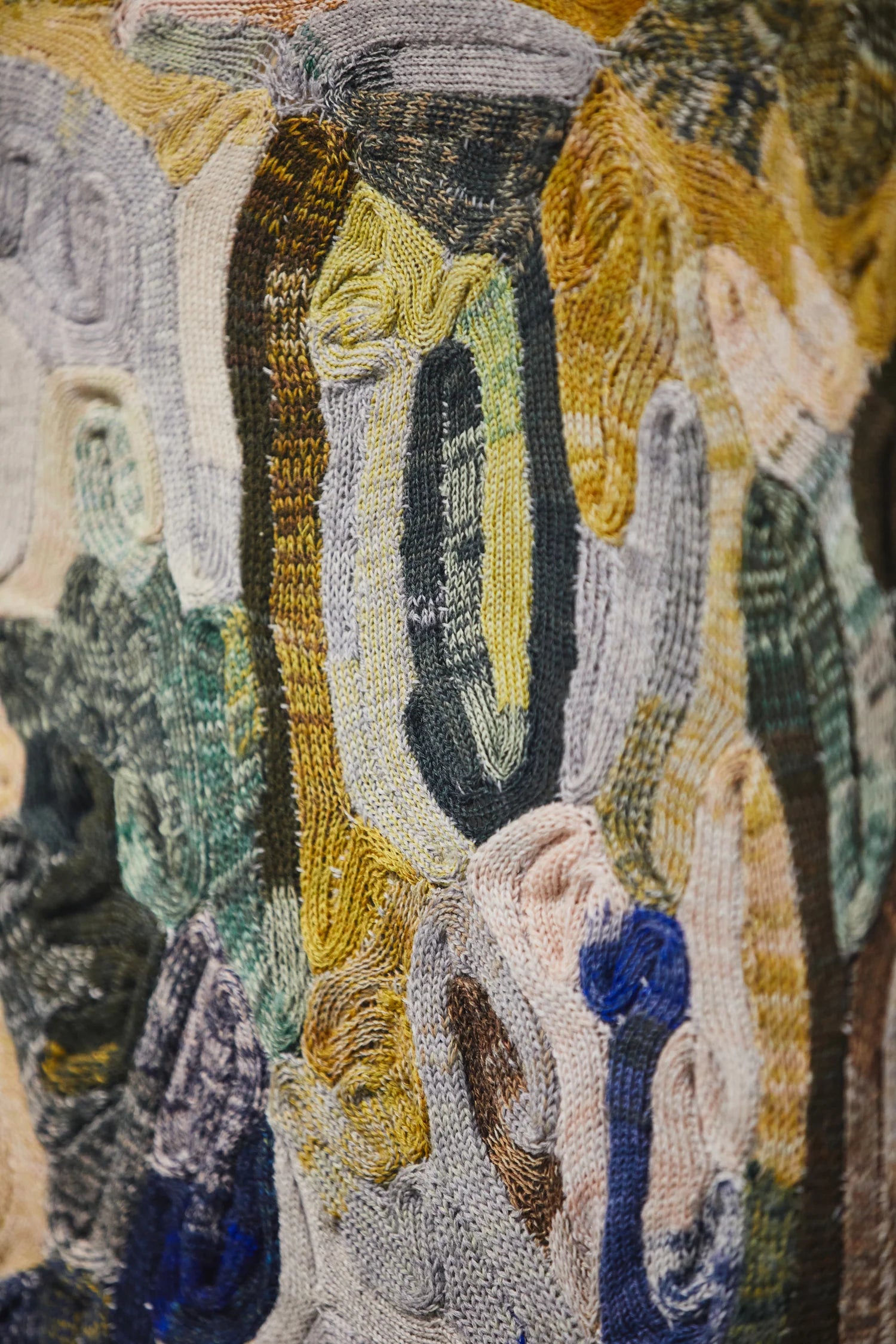 "Conversations" is a knitted interpretation of stream-of-consciousness writing - delving into the introspective process of connecting with oneself during a time of change. By pushing the boundaries of knitting and crochet, Tausend challenges traditional perceptions of craft, transforming the emotional depth of internal dialogues into abstract textile forms. "Conversations" invites viewers to reflect on their own inner landscapes and the profound connections formed through self-awareness.