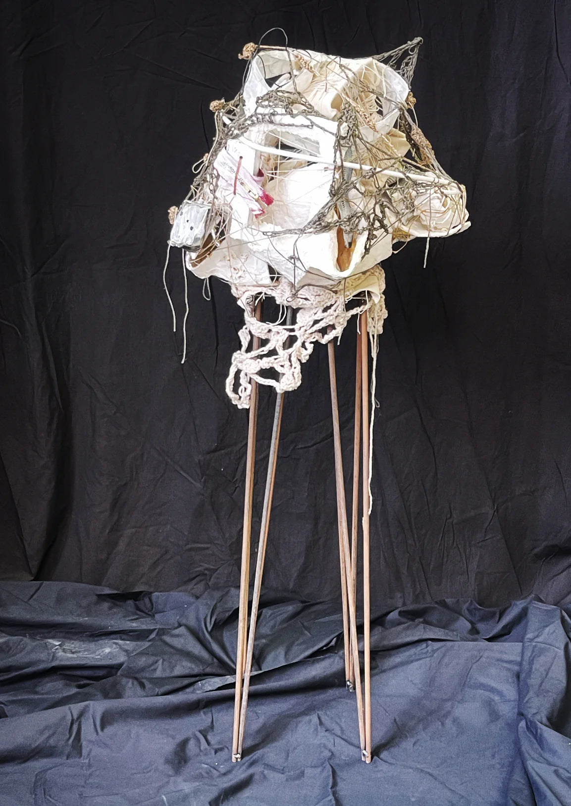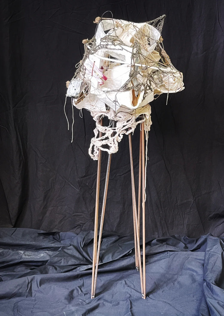 “Contained” addresses the theme of connection within the history of our lived in spaces. What we keep, collect, cherish and abandon. Giving the viewer an insight into the artists personal history and life, materials are connected together using traditional techniques such as knotting, looping and wrapping to create dense mass. Legs have been added to reflect the ability to morph and move ourselves while carrying memories, legacy connection and our container of self.