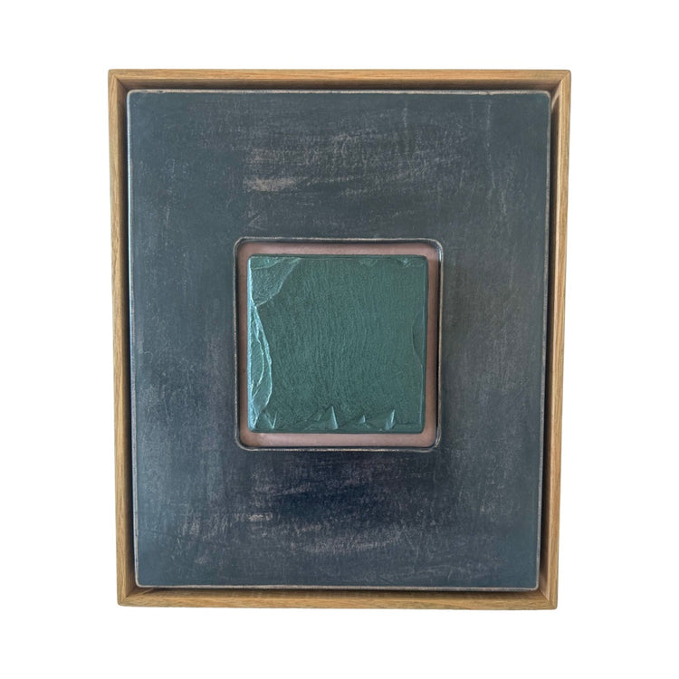 BENJAMIN GALLAGHER I 40.5 X 34CM I CAST ALUMINIUM, STEEL, BRIDAL LEATHER, ENAMEL AND OXIDES ON BOARD WITH WAXED OAK FRAME