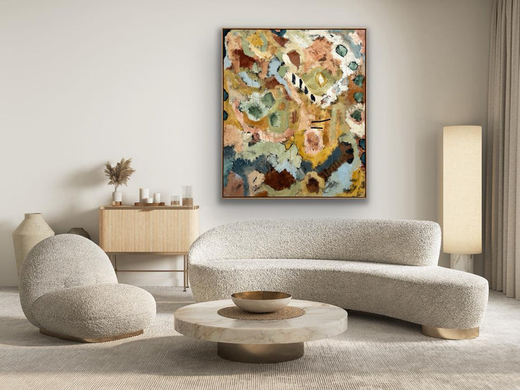 108CM X 128CM I MIXED MEDIA ON CANVAS I FRAMED IN EUCALYPTUS