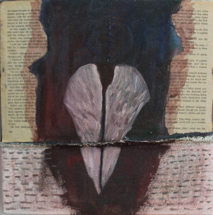 OIL, BOOK-PAGES & SEWN CANVAS I 28CM X 28CM