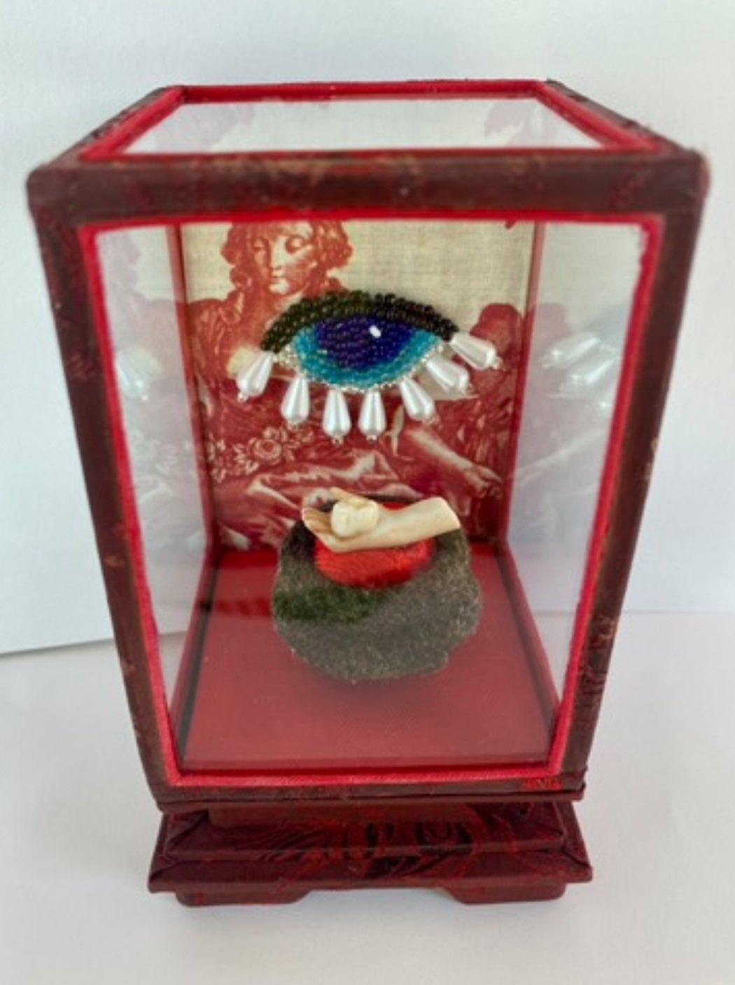 This work continues my exploration into historical hairwork ,symbolism and humans desire for expressions of loss , grief and mortality. I have used my own hair to create flocking and my child’s tooth. Eyes, hands and tears have been used throughout history to represent emotions and feelings in an economical and universal language.