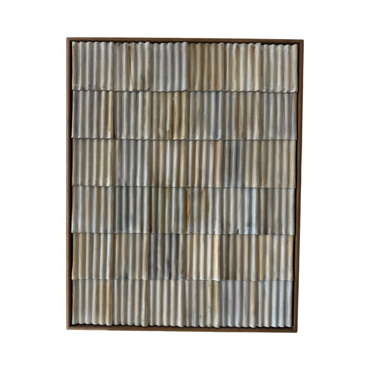 BENJAMIN GALLAGHER I 81 X 65 X 6CM | ALUMINIUM, CANVAS, GESSO, SLAKED LIME, RUSTY IRON OXIDE, BUILDERS OXIDES AND PASTEL ON BOARD WITH WAXED SPOTTED GUM FRAME