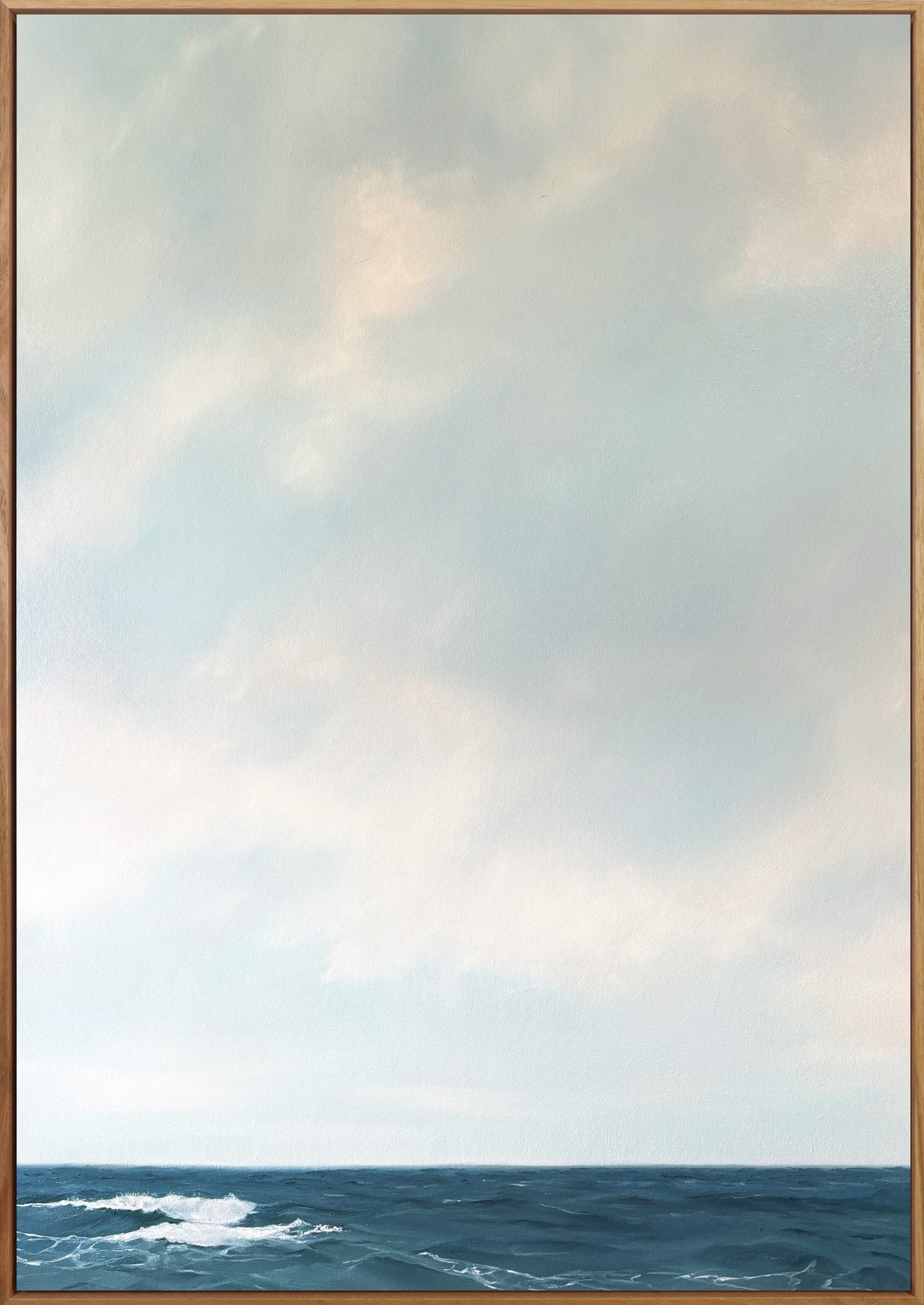 Skyward is from a body of work exploring themes of solitude, contemplation, and a sense of human insignificance within the vast natural environment. The ocean and sky’s moods transcend any specific geography, and this painting invites moments of quiet reflection.