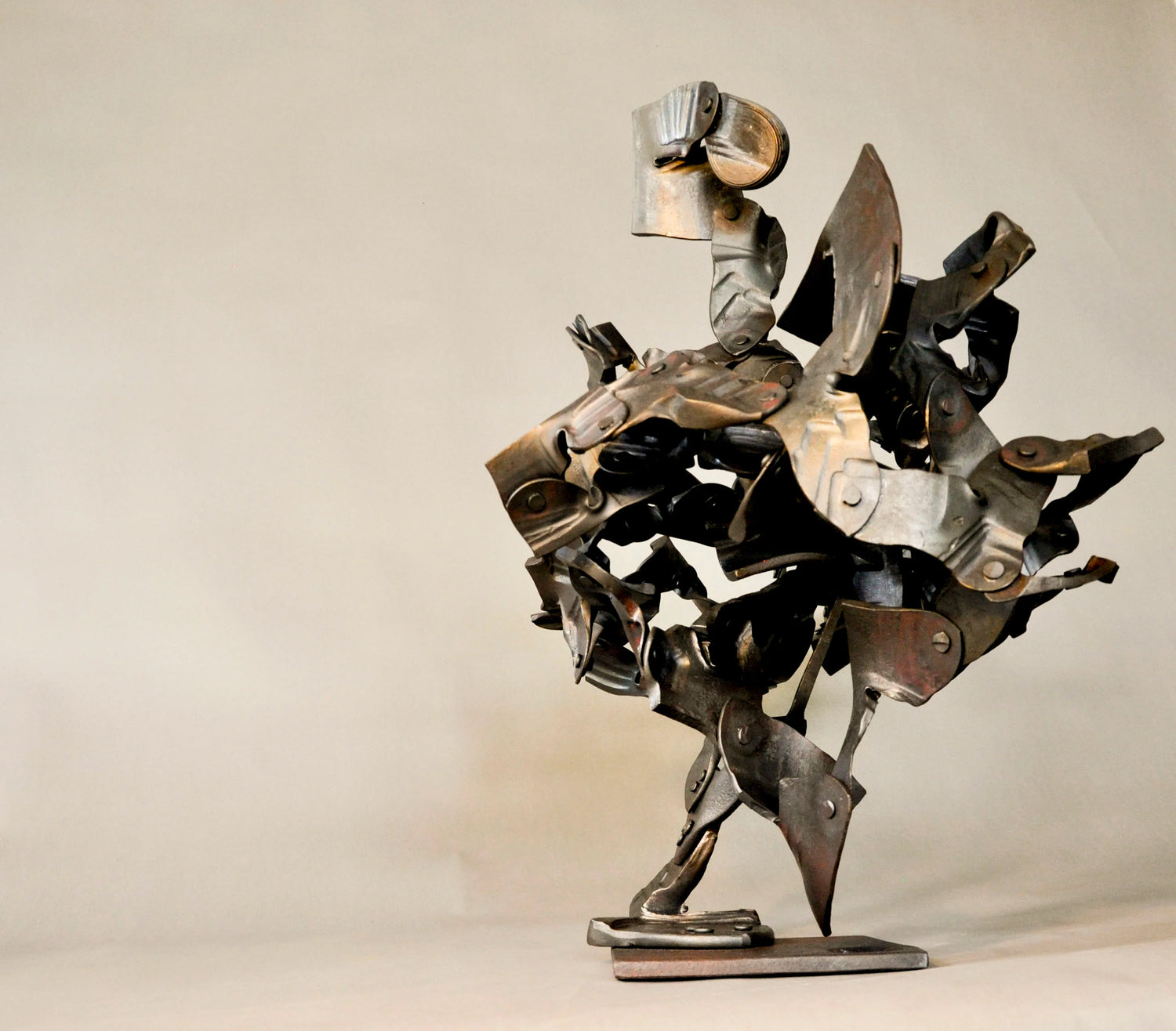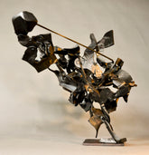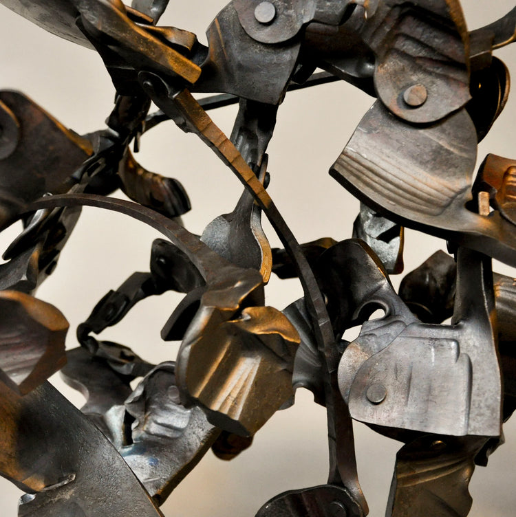 Under the guise of simply riveting a multitude of small irregular parts together is a heartfelt moment of connecting with the already connected. A fleshy body with rusty tools, burning gas, concrete floors, thumping machinery and humble iron bar. All these acting to reflect an ebb and flow of being and becoming what is. De-centring the foundations of metallurgy to encompass the messy echoes of an ever-present context of existing.