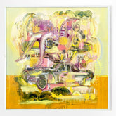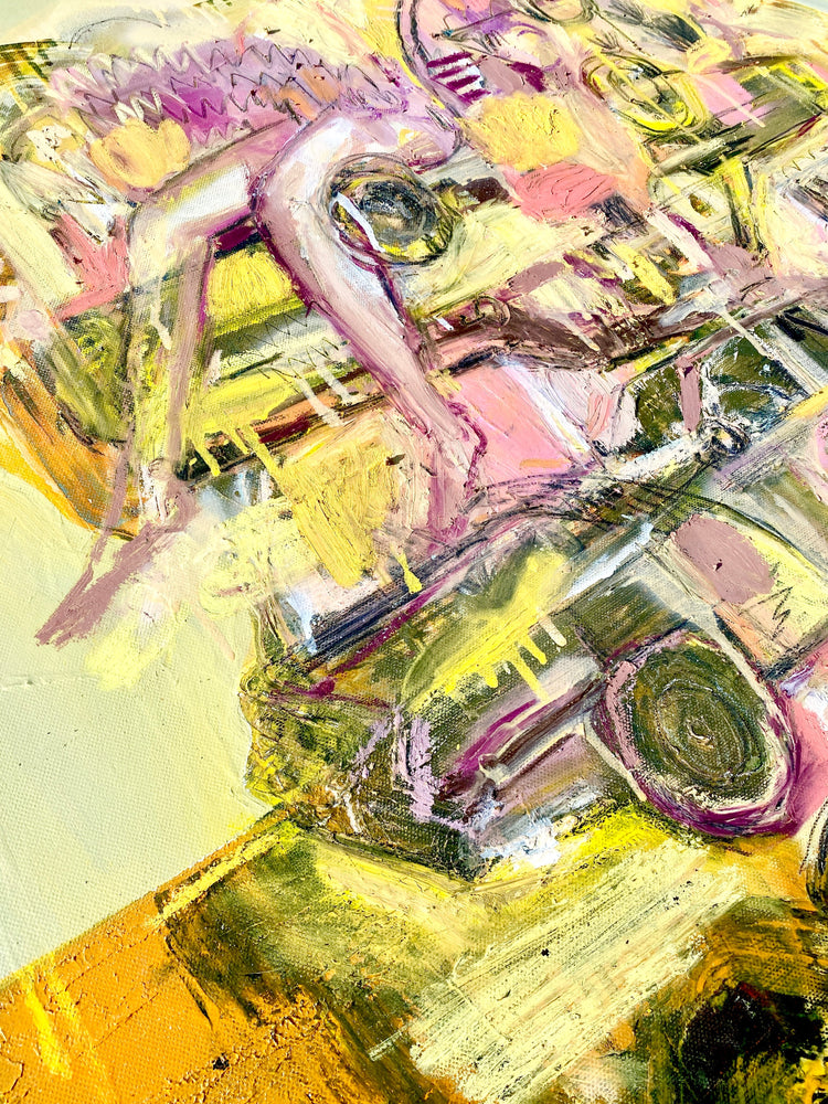 This painting explores tension between memory and change. Two cars, one overturned atop the other, act as a metaphor for the past clinging to the present. Layers of painted, drawn, and scratched lines and imagery reveal memory’s complexity - often hidden, yet present. Warm hues evoke nostalgia, while symbols of engines, organic forms, a fragmented figure, and fire highlight the interplay between mechanical detachment and emotional connection.