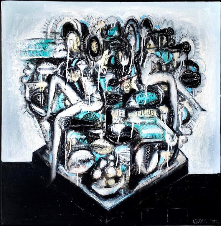 82CM X 82CM I SPRAY PAINT, ACRYLIC, WAX PENCIL & OIL STICK ON CANVAS I CUSTOM FRAMED IN TIMBER I 2024
