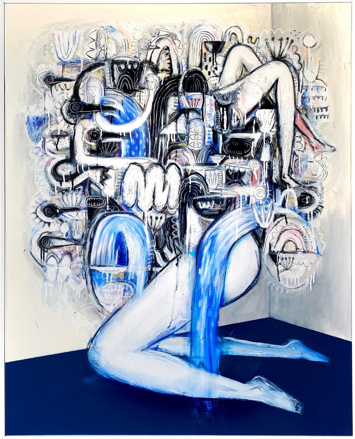 92CM X 103 CM I SPRAY PAINT, ACRYLIC, WAX PENCIL & OIL STICK ON CANVAS I CUSTOM FRAMED IN TIMBER I 2024