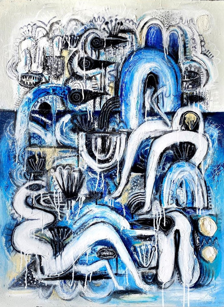 76CM X 102CM I SPRAY PAINT, ACRYLIC, WAX PENCIL & OIL STICK ON CANVAS I CUSTOM FRAMED IN TIMBER I 2024