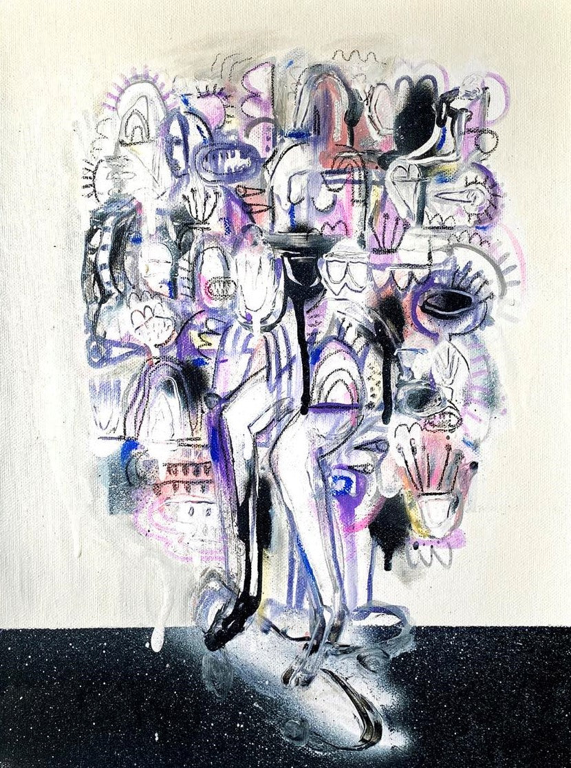 41CM X 31CM I SPRAY PAINT, OIL ACRYLIC, WAX PENCIL ON CANVAS I CUSTOM FRAMED IN TIMBER I 2024