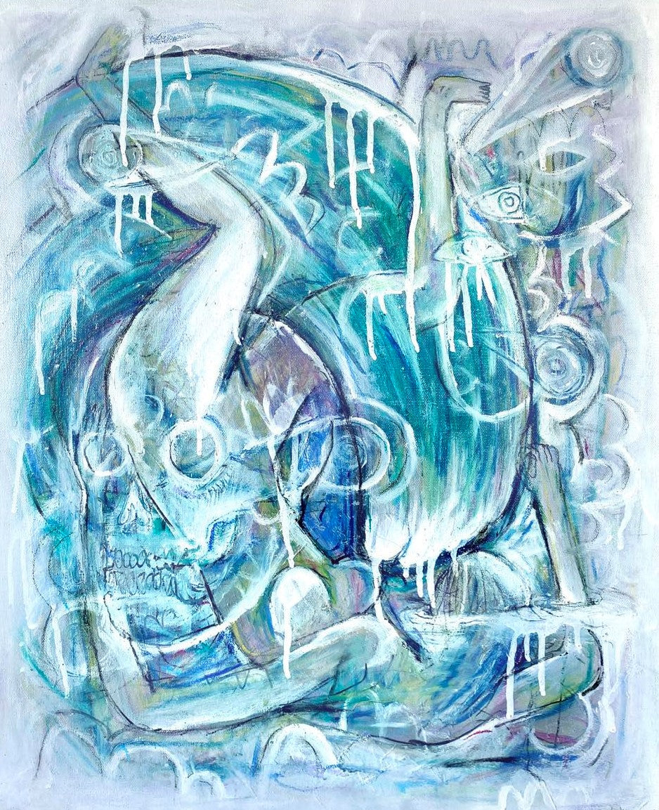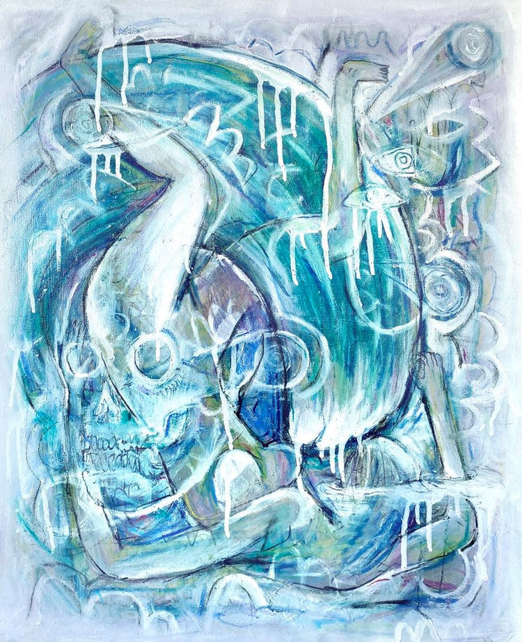 53 X 63CM I SPRAY PAINT, ACRYLIC, WAX PENCIL & OIL STICK ON CANVAS I CUSTOM FRAMED IN TIMBER I 2024