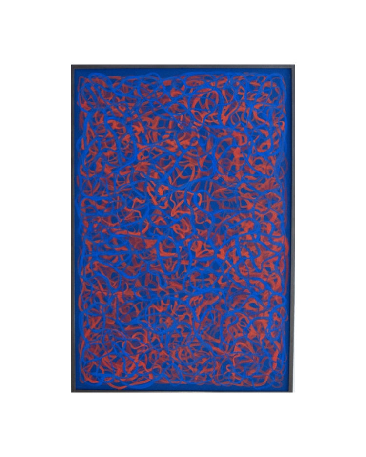 This piece explores the artist’s fascination with Complexity | the governing uncertainty principle is let loose whilst creativity progresses across the canvas.” (MLG) In the process, applying the boundaries of colour above and below, the artist finds a place where energy dwells.