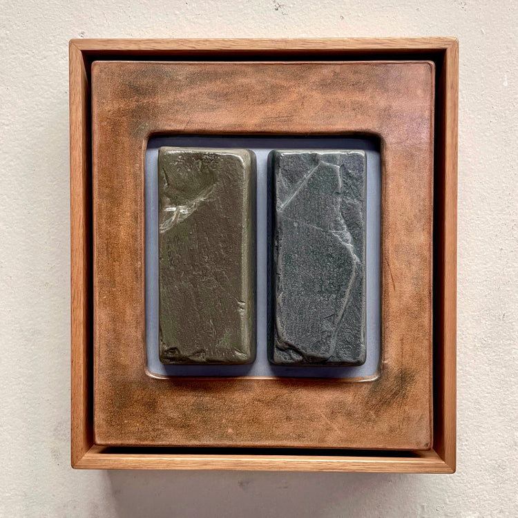 BENJAMIN GALLAGHER I CAST ALUMINIUM, STEEL, BRIDAL LEATHER, COPPER, ENAMEL & OXIDES ON BOARD WITH A WAXED OAK FRAME I 27CM x 24CM X 6.5CM
