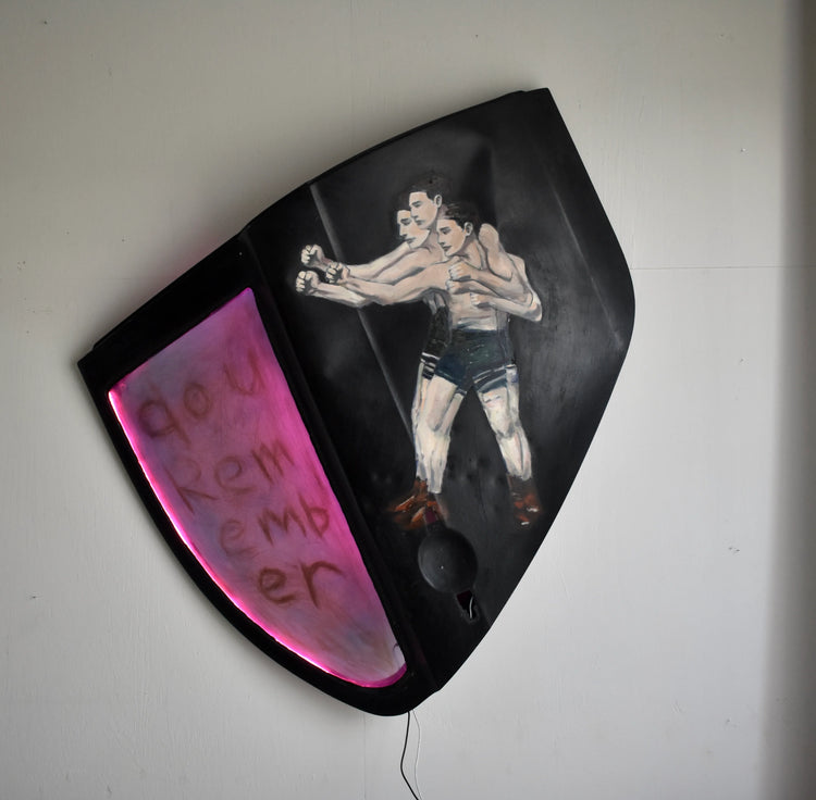 MIXED MEDIA ON FOUND METAL CAR DOOR WITH NEON LIGHTING I 125 X 130CM
